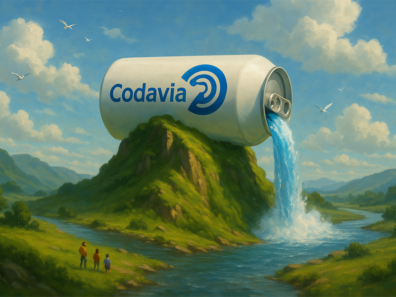 يك منظره سوررئال وفوتورئاليستى كه در آن يك قوطى بزرك برند """ "کداویا" بالاى كوهى سرسبز قرار كرفته واز درب آن آبشارى عظيم از مايع آبى شفاف بيرون مى ريزد. آبشار با پاشش وحباب هاى جشمكير به رودخانه اى پهن تبديل مى شود كه از ميان درهاى آرام عبور مى كند. افراد كوجكى در كنار رود ايستاده اند وازاين منظره شكفت انكيز لذت هى برند. آسمان پراز ابرهاى يفى و پرندكان در حال پرواز است و كل صحنه با نورى طبيعى و ملايم روشن شده. فضاى كلى خيال انكيز، شاداب و فانتزى است جزييات بدنه بطرى را مانند تصوير مرجع بساز """